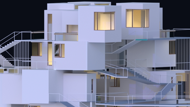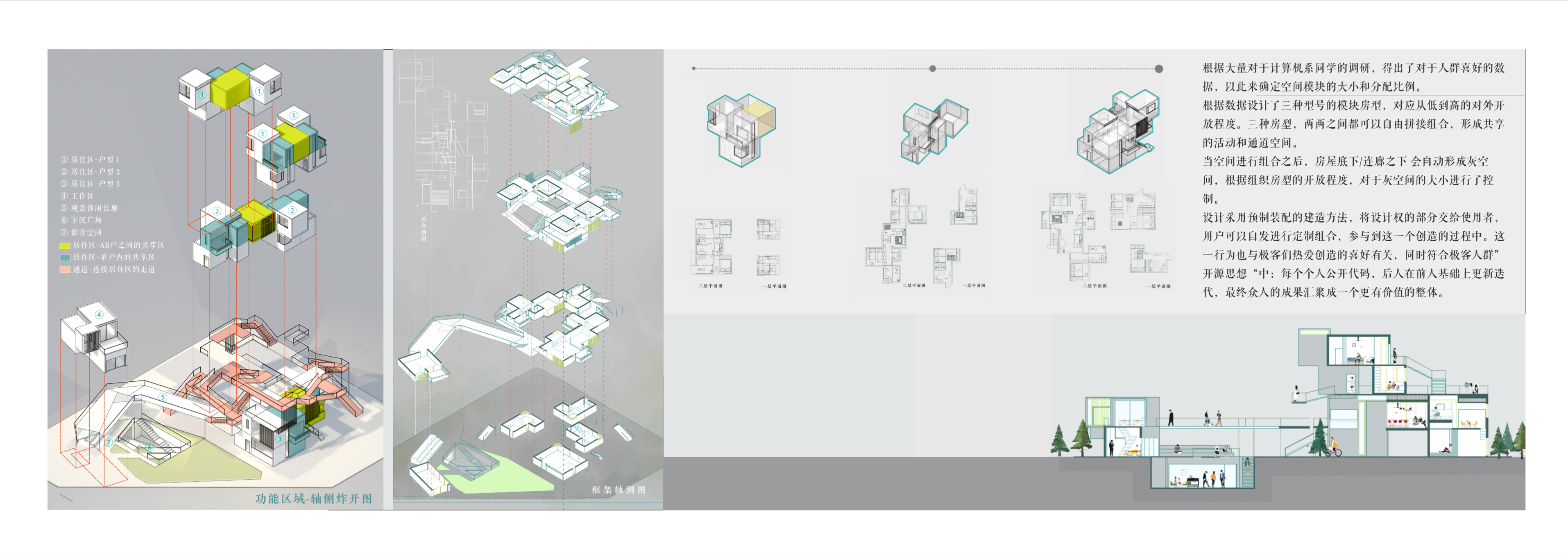 According to the data, three types of modular house types are designed, corresponding to the degree of opening to the outside world from low to high. The three room types can be freely spliced and combined to form a shared activity and passage space.
