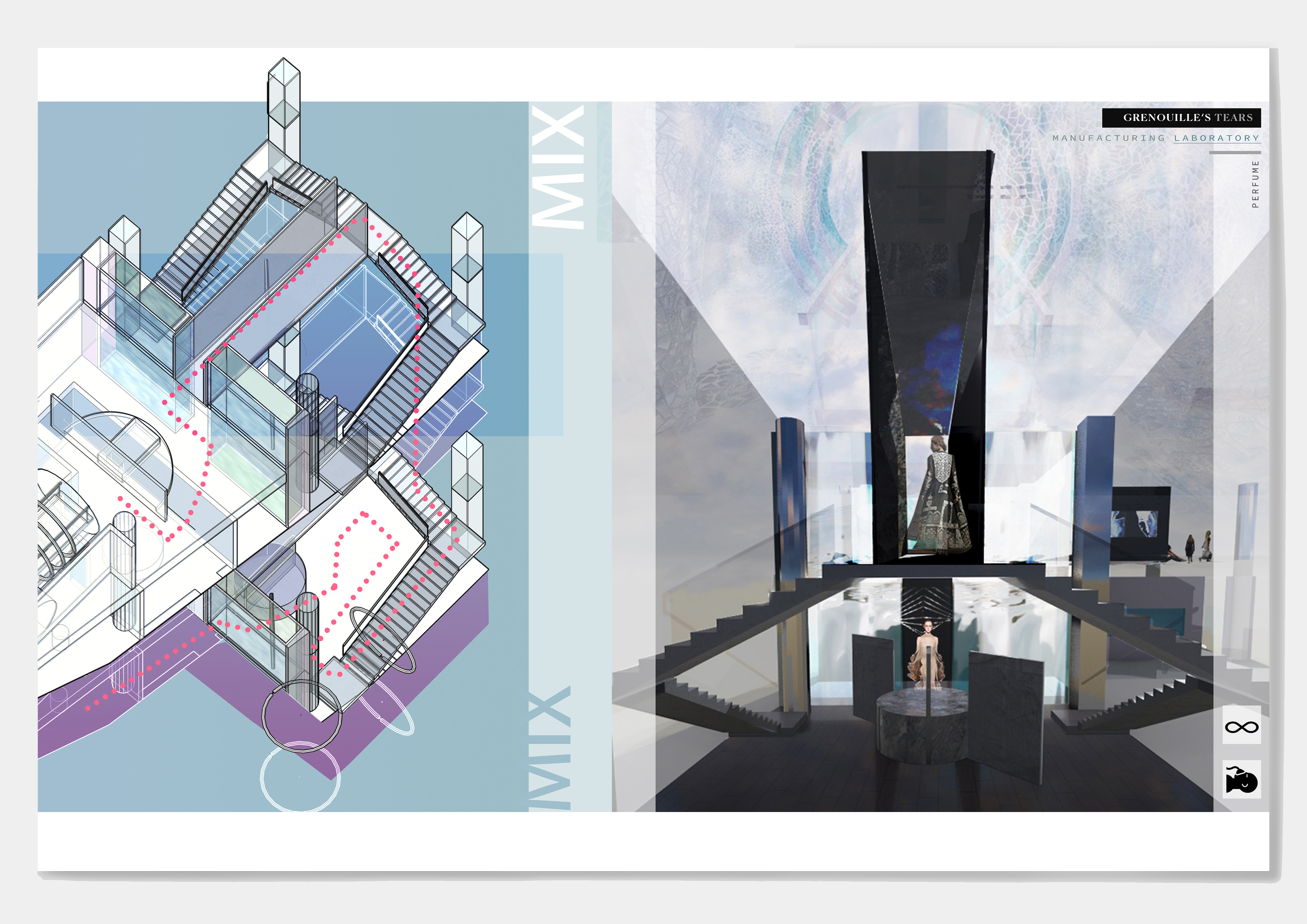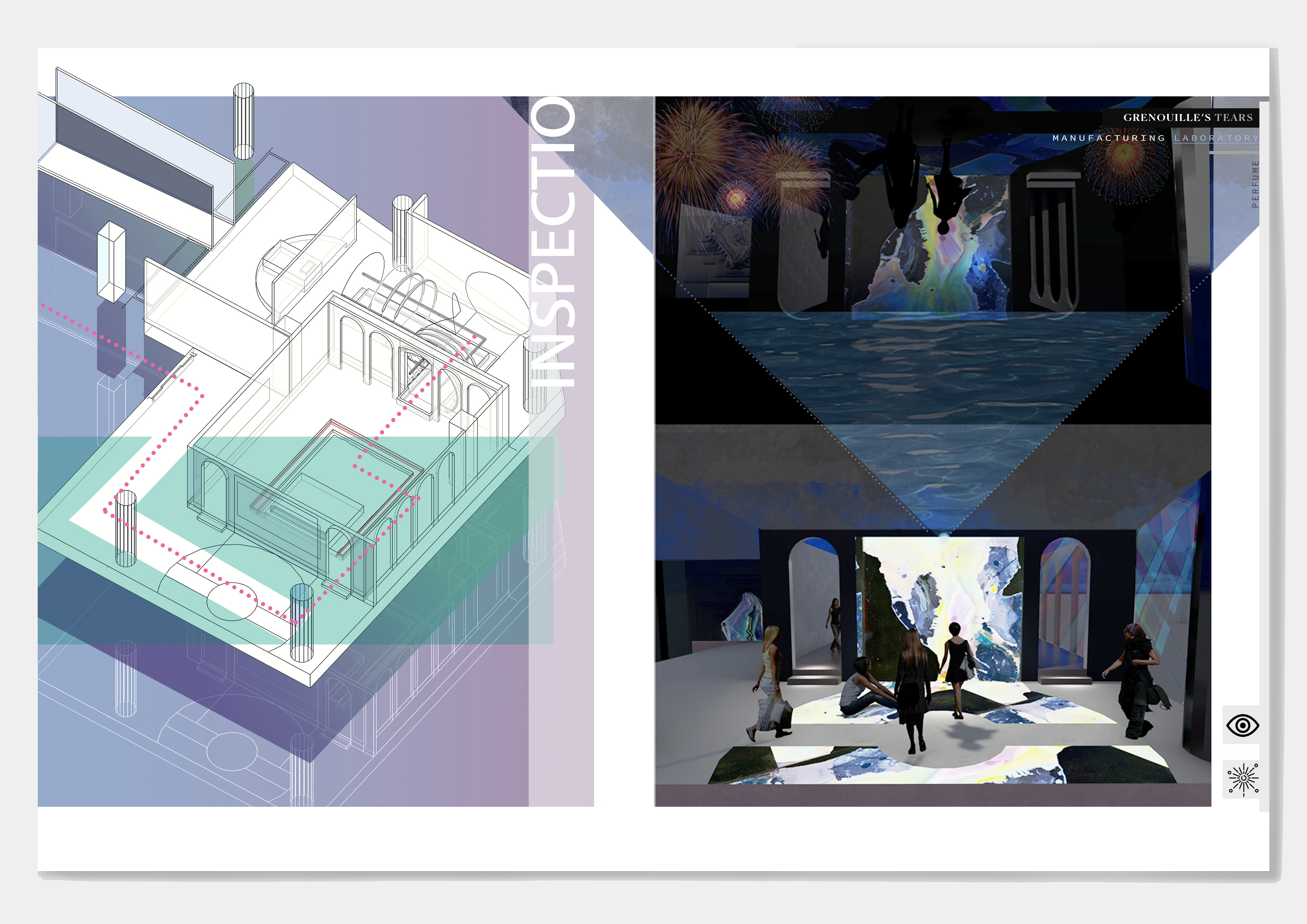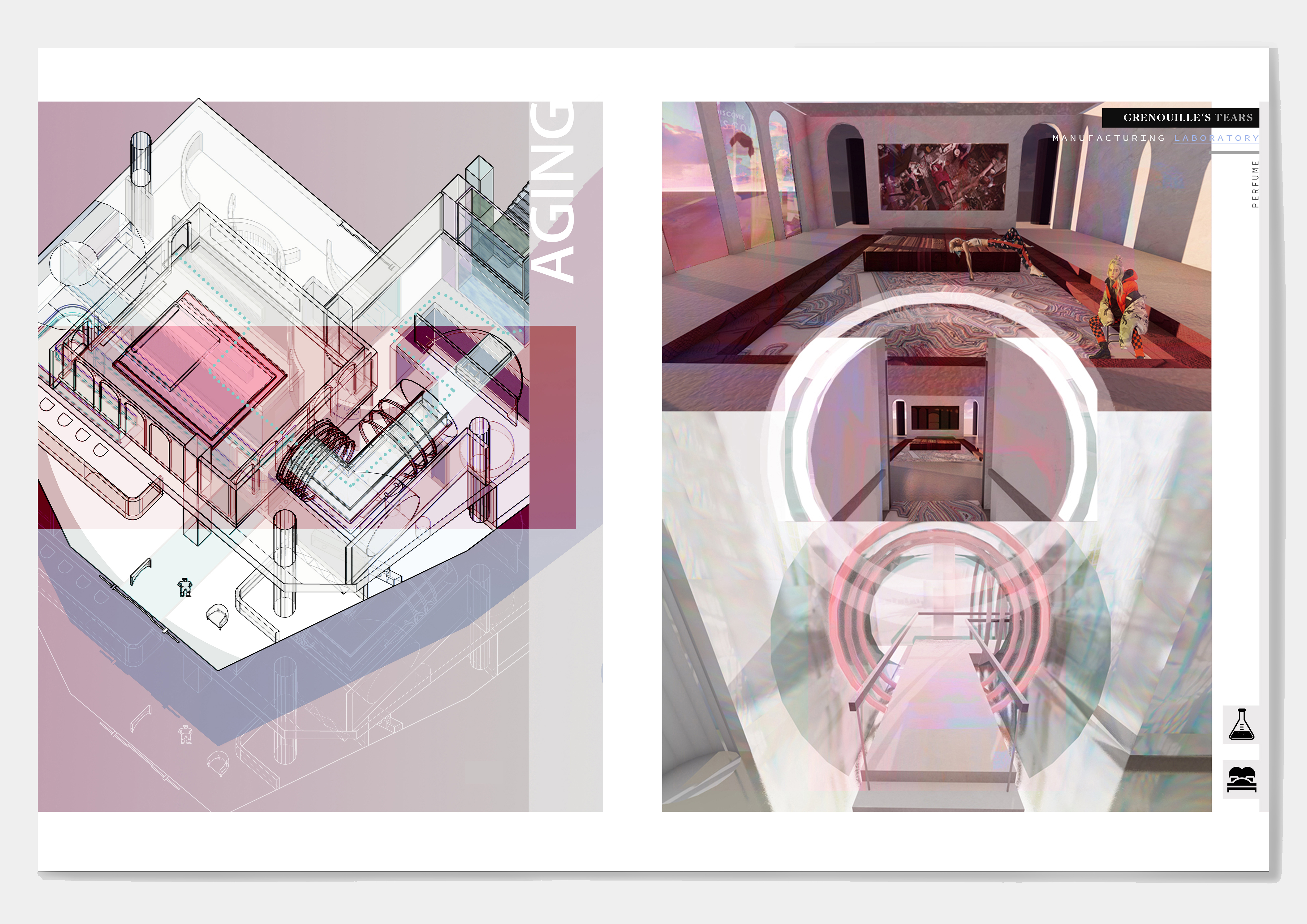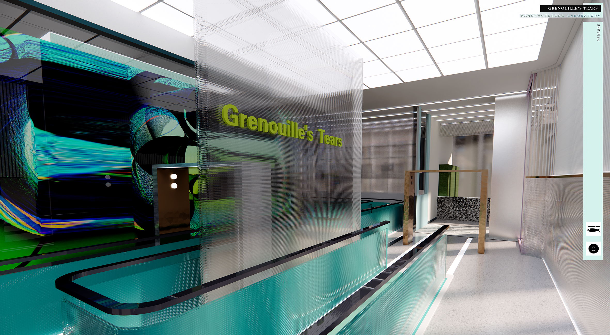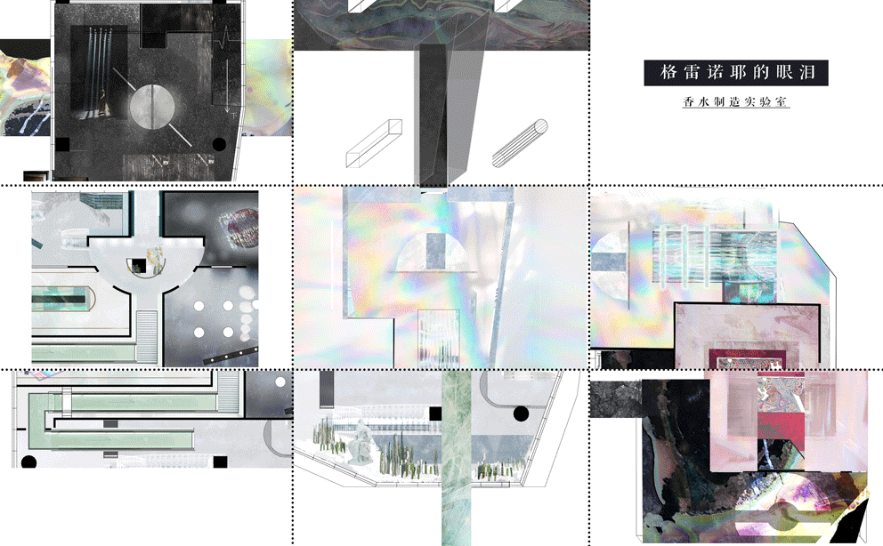 "Grenouile's Tears" is a real-time perfume manufacturing laboratory, showing the laboratory's space manual, where the identity of people and things are replaced, and people have become the materials and media for studying new perfumes. The context of the plan comes from the movie "The Great Gatsby". By extracting the objects, elements, events, and behaviors that constitute different scenes in the movie, and discussing consumer behavior, the focus is finally locked on the four parties in the movie. People will show different postures in front of different people and scenes. In order to be in the crowd, they will continue to build an instant self and influence others. The elements extracted from the four parties are combined with the steps of making fragrances and the characteristics of perfumes to create a linear heterotopia space where people walk through the passage and continue to be transported by the production line to the next space as commodities.