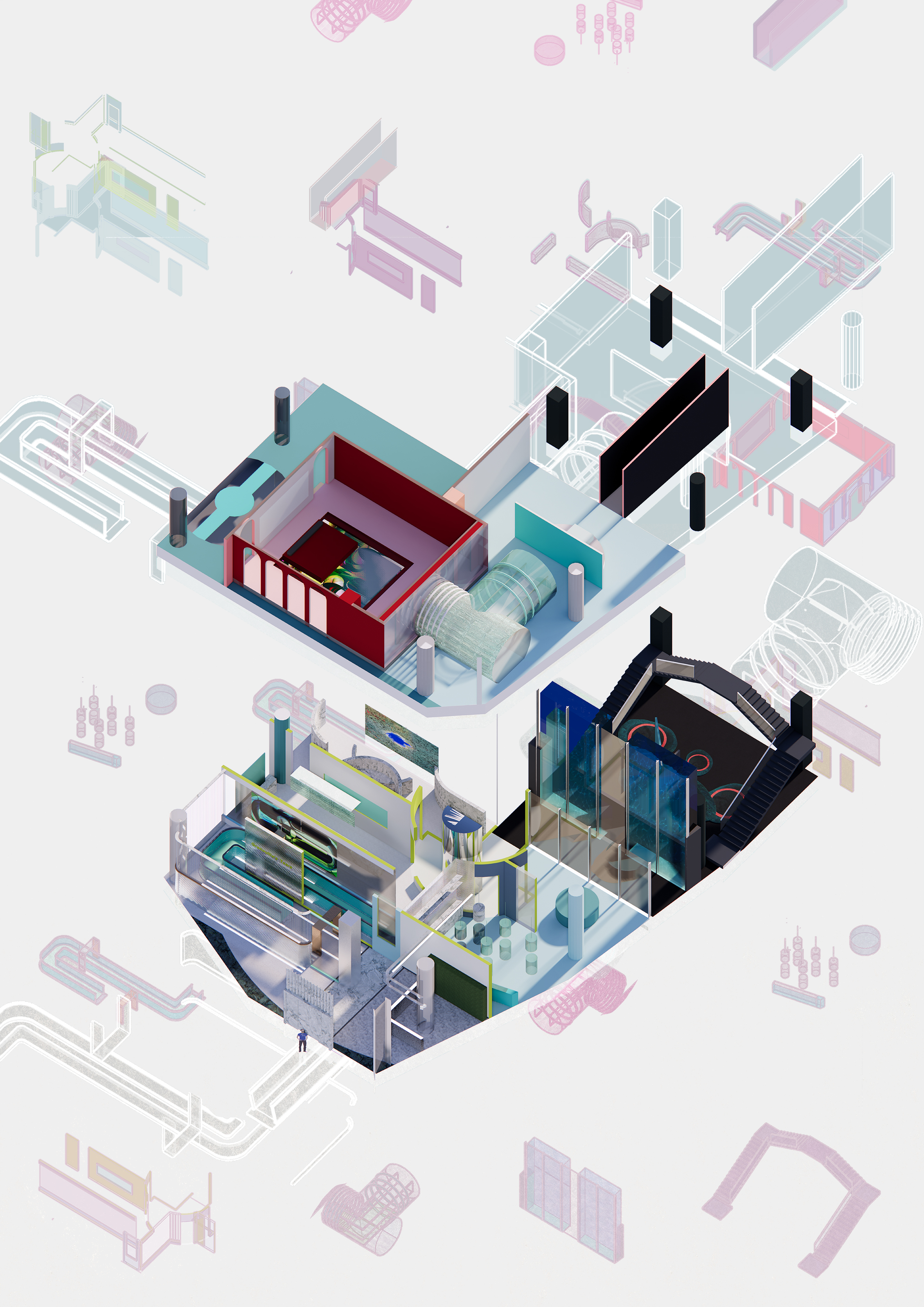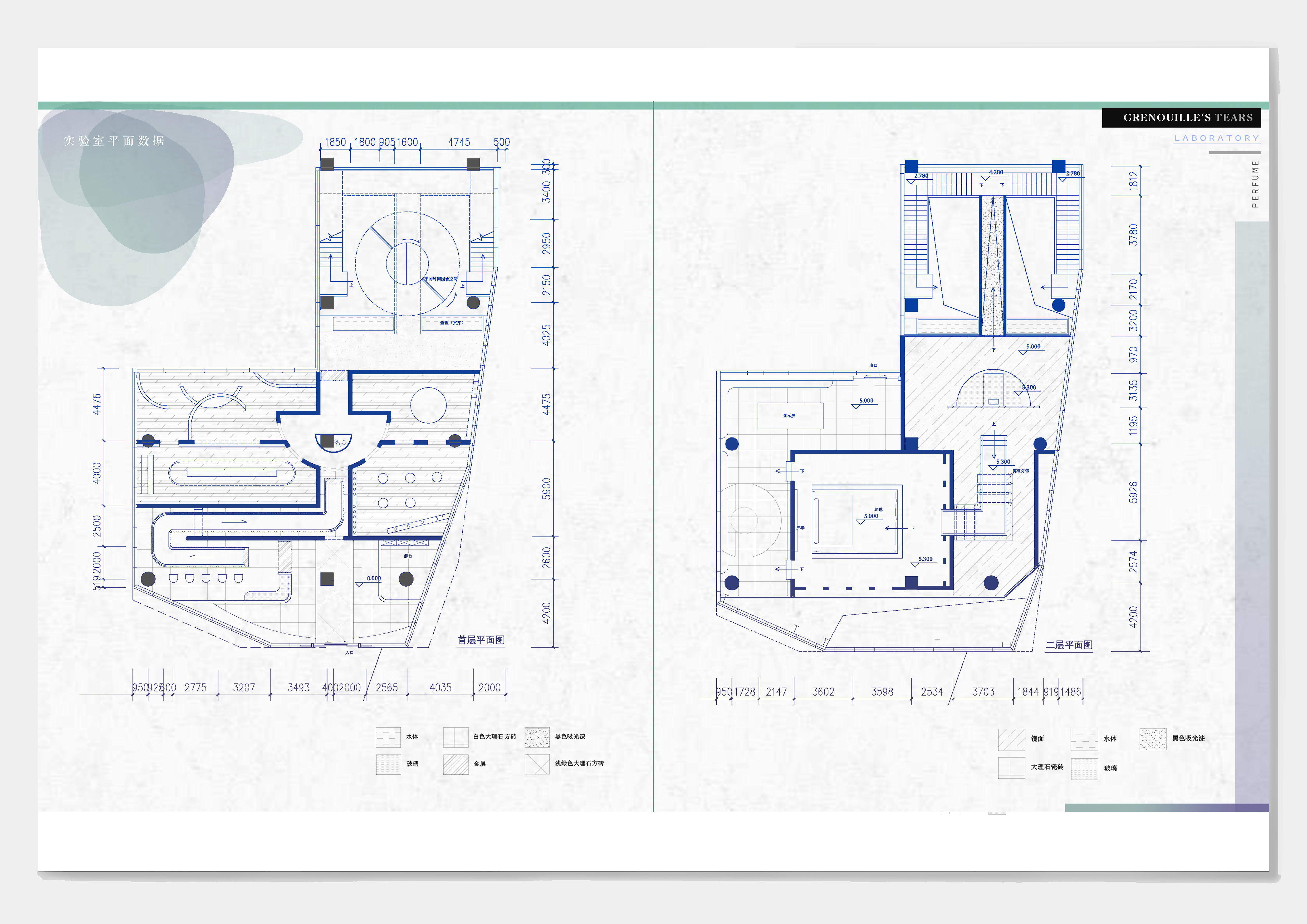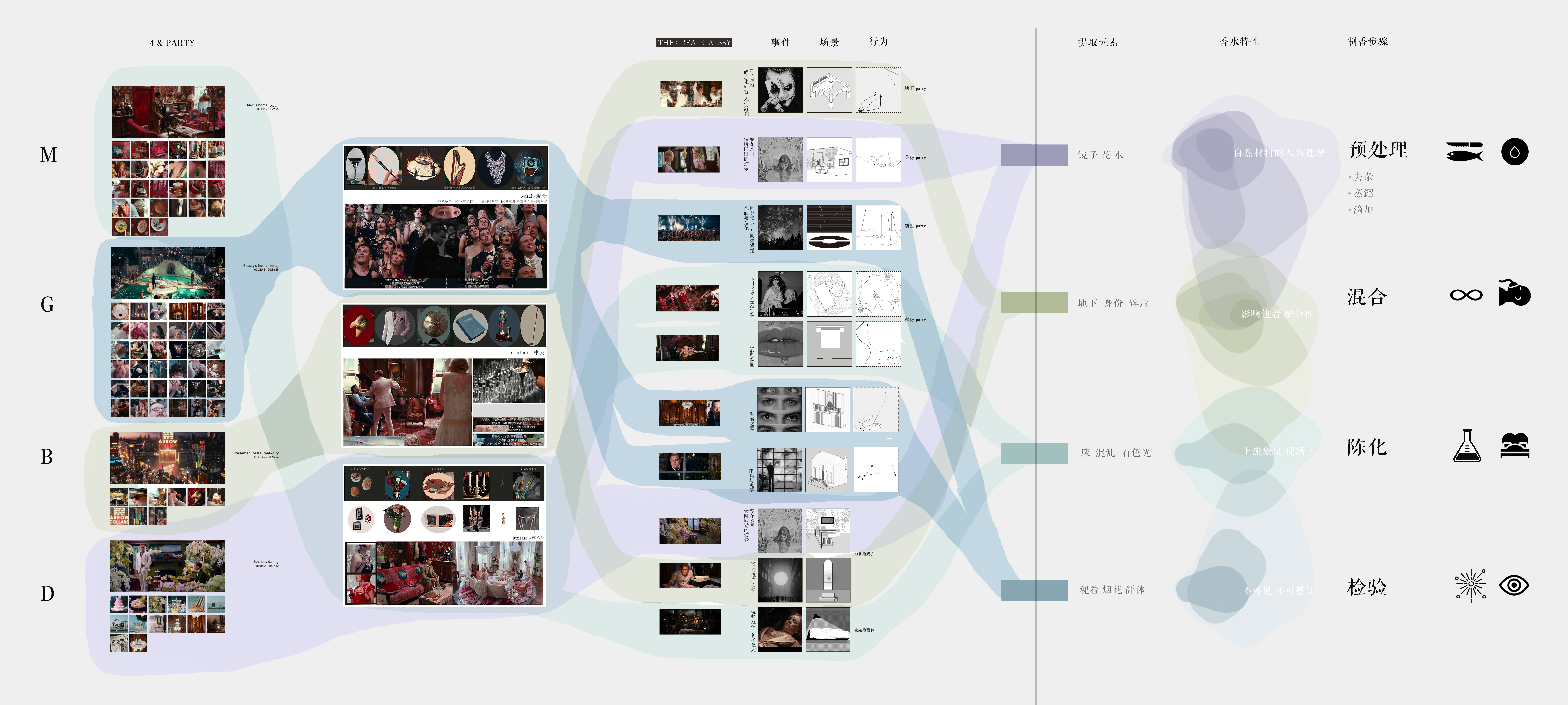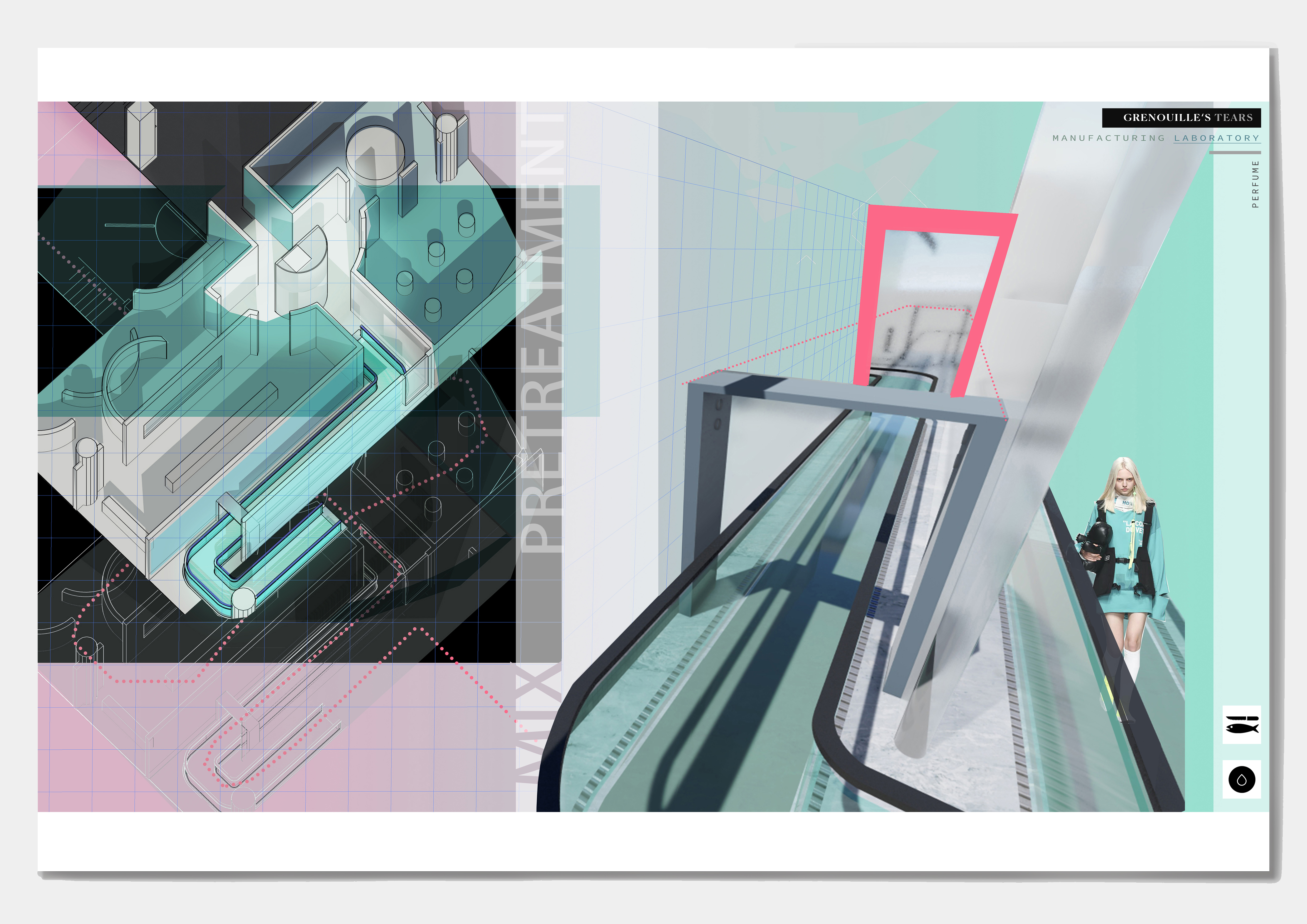 "Grenouile's Tears" is a real-time perfume manufacturing laboratory, showing the laboratory's space manual, where the identity of people and things are replaced, and people have become the materials and media for studying new perfumes. The context of the plan comes from the movie "The Great Gatsby". By extracting the objects, elements, events, and behaviors that constitute different scenes in the movie, and discussing consumer behavior, the focus is finally locked on the four parties in the movie. People will show different postures in front of different people and scenes. In order to be in the crowd, they will continue to build an instant self and influence others. The elements extracted from the four parties are combined with the steps of making fragrances and the characteristics of perfumes to create a linear heterotopia space where people walk through the passage and continue to be transported by the production line to the next space as commodities.
