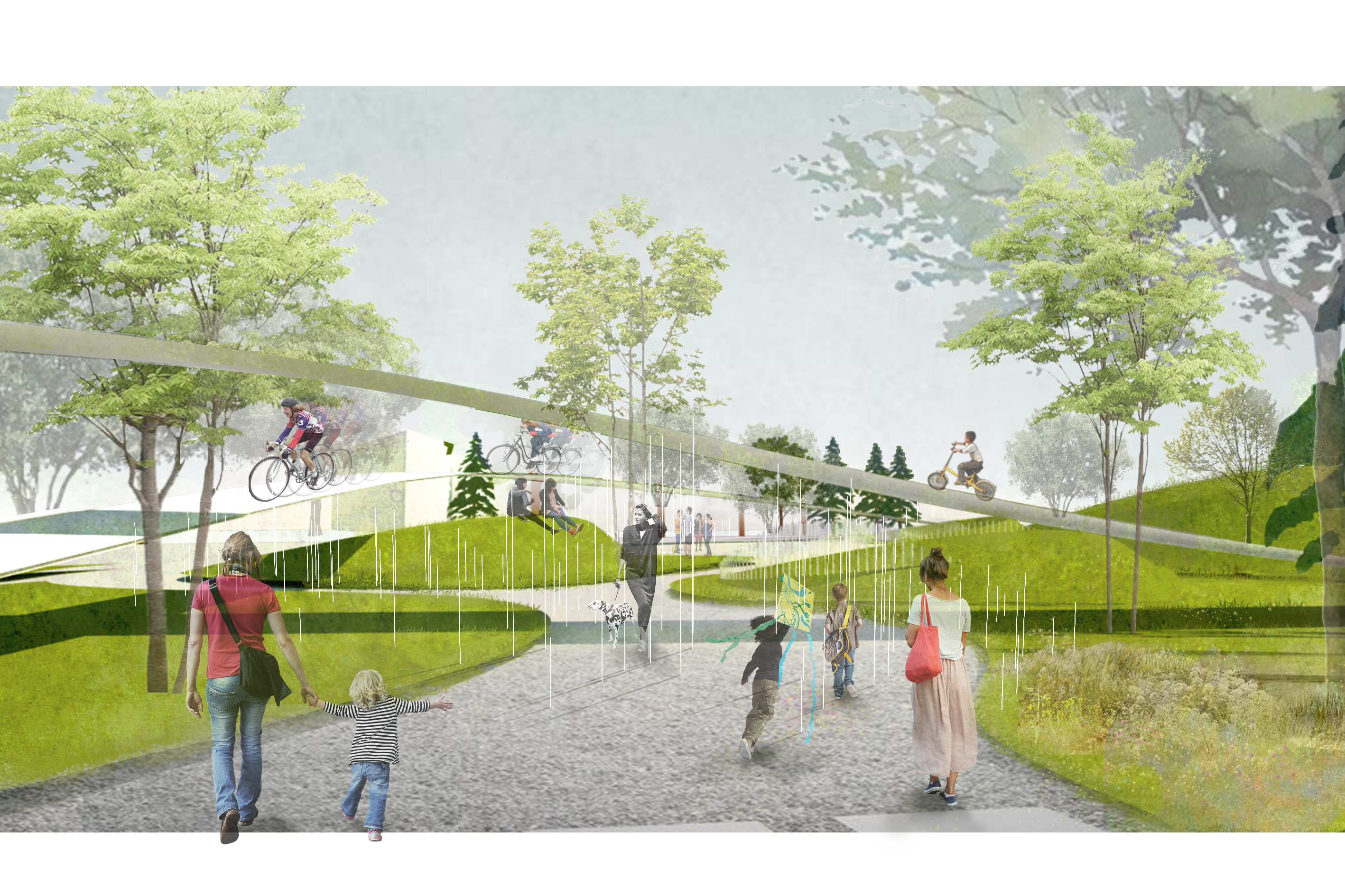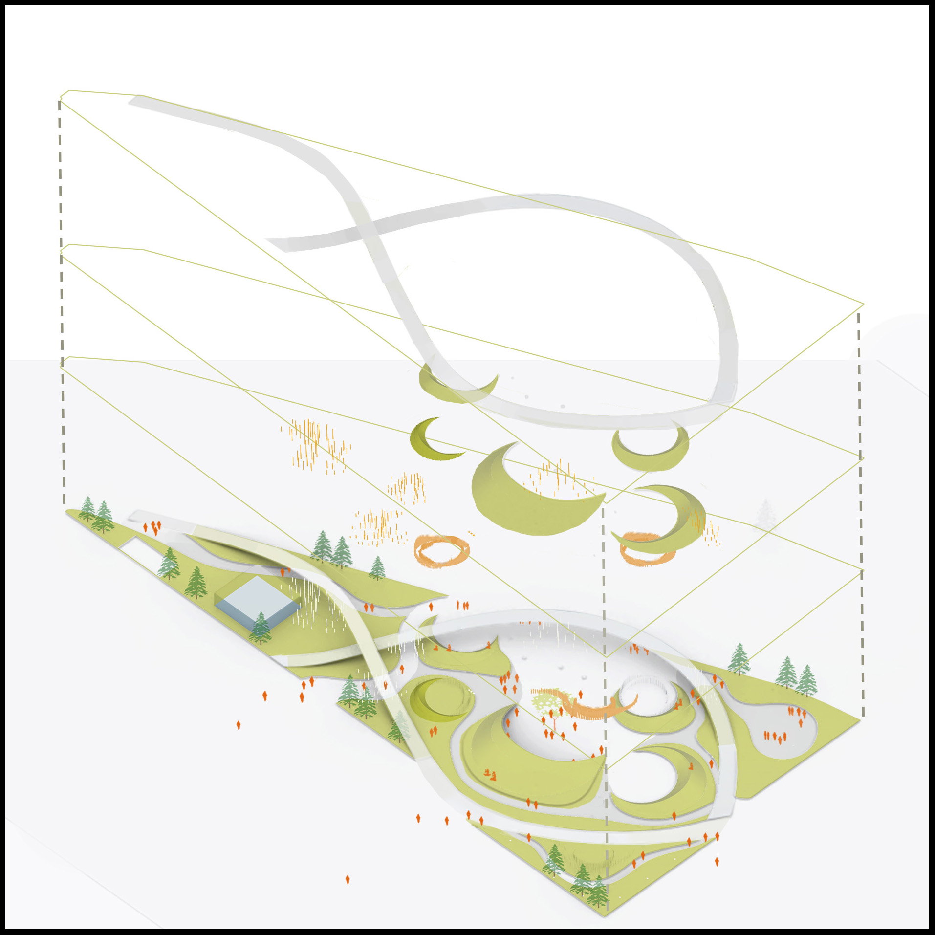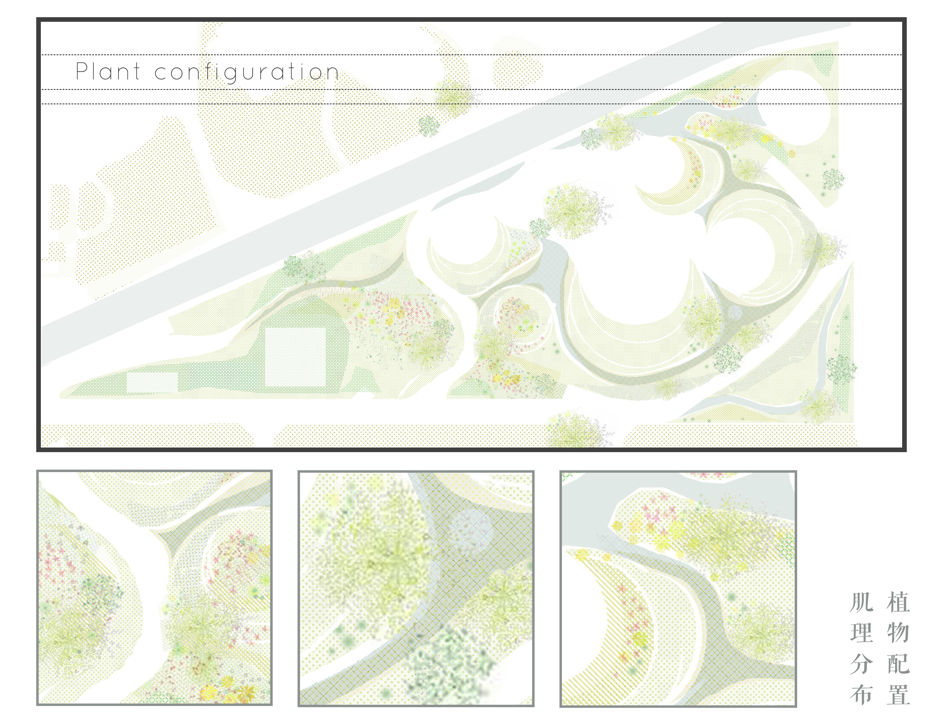 从动线入手推导形态生成。以速度为线索,分析地面走路的慢节奏人群与桥上骑车的快节奏人群活动。根据高度、视线、远近、行为等方面,置入自然的山丘与参数化生成的线状山丘,构建快与慢不同的空间体验。