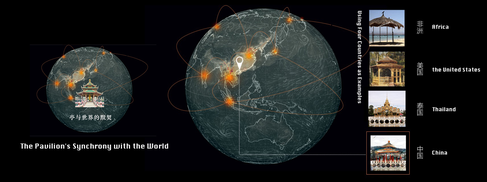 Architecture is a reflection of culture and environment, while a pavilion serves as a miniature architectural unit, a significant carrier of culture. The design presupposes the existence of a world where cultures freely drift and blend, transcending all boundaries. In this world, cultural elements flow and merge without restraint. For the real world, this is a heterotopia. The design creates an interface through weighted fusion of geographic coordinates and cultural symbols with pavilions. Through this interface, we can touch fragments of that world - be it a poem, a postcard, or a travelogue - allowing us to glimpse a corner of a world without cultural borders.